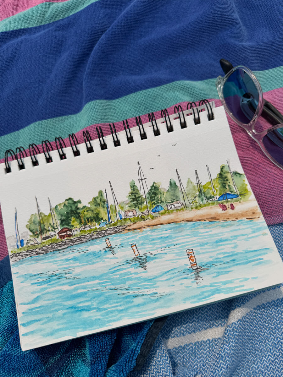My current favorite tools are watercolor markers and ink pens, on mixed media spiral sketchbooks, not larger than 9×12. I travel light so I can work on a boat, at the beach or in the studio. This sketchbook style, along with my handwritten notes or titles is how I interpret the world. It’s my souvenir from a day well spent.